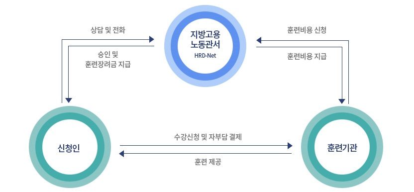 1) 국민내일배움카드 발급신청 ▶ 본인 거주지(주민등록) 고용센터를 방문하거나 HRD-Net을 통해 신청